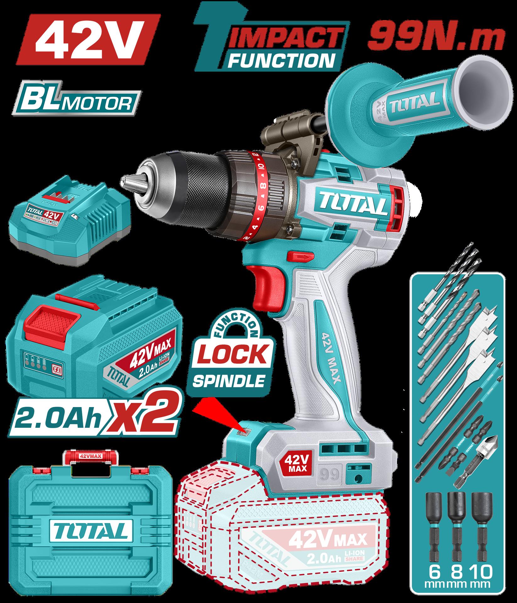 TALADRO INALAMBRICO PERCUTOR 1/2" 99 NM 42V CAJA PLASTICA INCLUYE 2 BATERIA 2.0AH, 1 CARGADOR Y ACCESORIOS INDUSTRIAL SUPER TOTAL (UTIDLI429982)